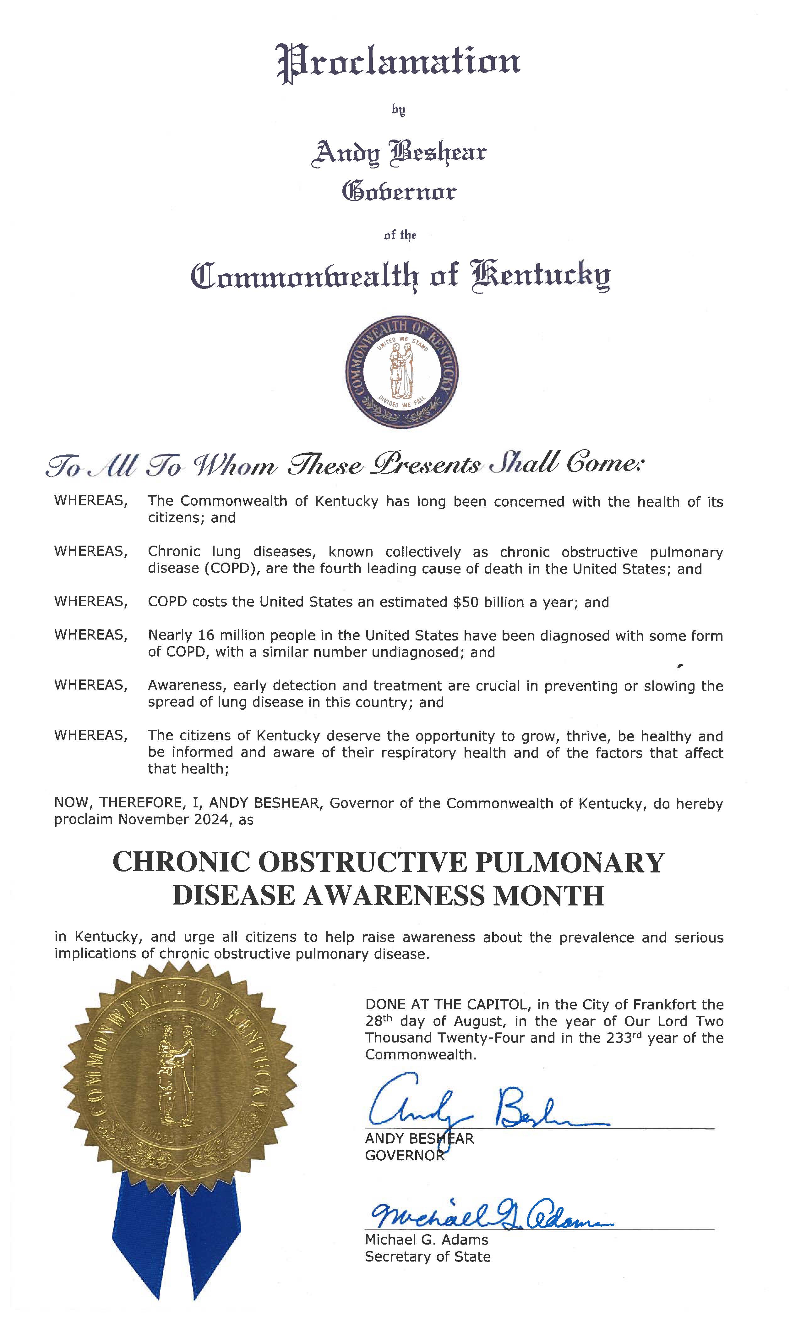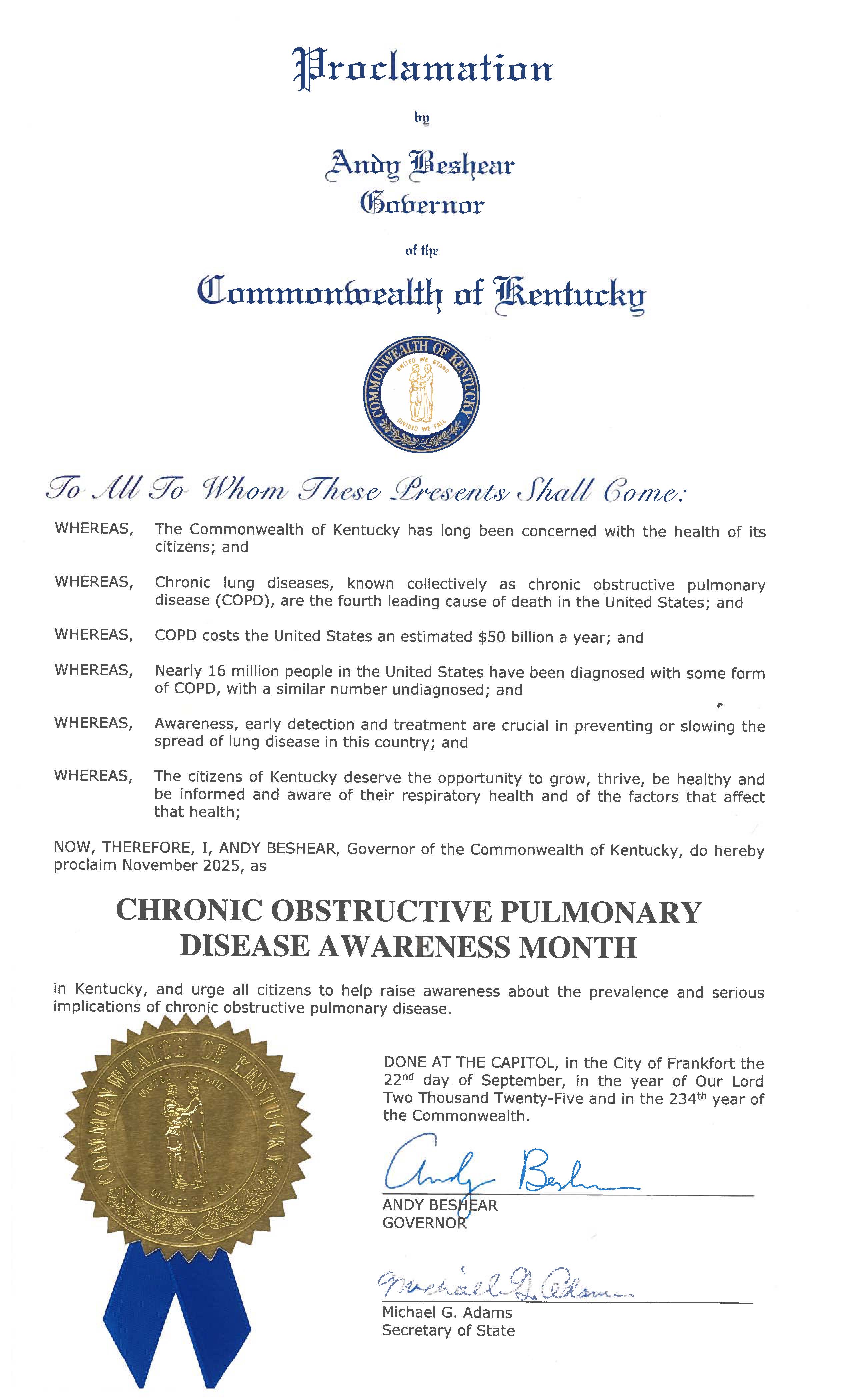 In late 2016, the Department for Public Health collaborated with state partners to create a Kentucky COPD Advisory Board. The board meets quarterly (March, June, September, December) to address COPD issues in the state. The board is currently working on development of a state action plan based on the national action plan. Get in touch to learn more and/or join the group.